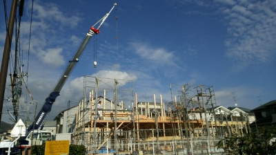 私は建て方2日目 ココは本体大工さん2人 応援大工さん2人計4名で建て方