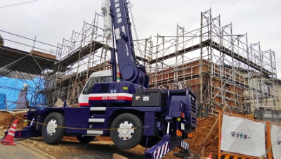 私は神戸で2日工程のパネルの建て方一日目 クレーンは道路使用許可を貰って道路設置