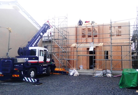 私は建て方2日目 昨日に続きボチボチやってきました 残すは明日の屋根パネルのみとなりました