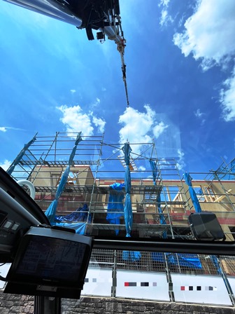 私はコンテナハウスの据付へ 運んできた増トンユニックでは希望の据付場所まで飛ばせないので ご依頼頂きました 先にユニックで現場に降してから交代で私が現場入り 11時半頃に据付完了 昼過ぎ帰社で午後は下見へ 午後2件下見してきましたけどコッチはお客様よりカニクレーンかもって言われて 慌てて見に行ったのですが3tが入れそうなので一安心 7月末の3tクレーンの木造建て方は、暑いやろな~ (;^ω^)