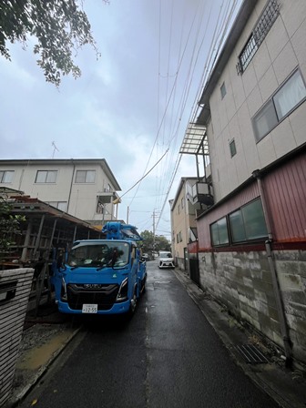 ココはRC1階の上に木造2階を載せる3階建てになる現場 3日工程なんですが、行き止まり道路で