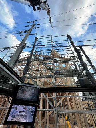 私はこの前荷降ろししてきた狭小地のSE構法建て方現場へ