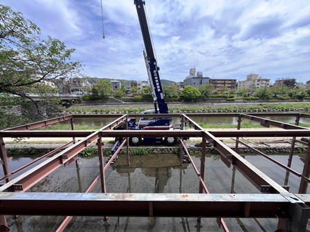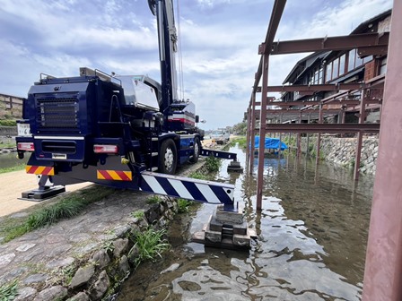 今日はミニ2台とピタ 私は季節物の納涼床組立て 雨の後で川の水量もソコソコ有って1段目の盤木は完全水没 ラジコンで一人で盤木押さえながら据えれるかなと思ったけど全然無理でした・・・ 鳶さんに流れて行きそうな盤木押さえてもらって残り4段積んで作業開始 観光客の数は明らか少ないですね まぁ、その方が出入りや作業中も楽で良いですけどね (笑)
