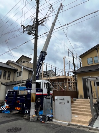 私はSE構法建て方 クレーン据える所には置ききれ無かった躯体材料が・・・ 道路に据えてフル伸縮で材料を基礎中に入れました 昨日ブームグリース塗ったトコなのに・・・ ブームグリース塗った翌日にフル伸縮 クレーン屋さんアルアルかな (;^ω^) 朝、30分タイムロスしましたが14時修了 今日はトップでガレージ戻りました !(^^)!