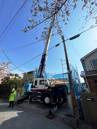私は木造建て方へ ラフターは何とか現場内へ