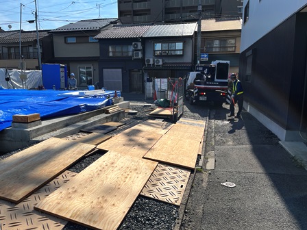 今日は連休前の最後の仕事 前回は息子と二人で行ったパネル現場へ 今日は弟と二人で行ってきました ウチから運んだ合板10枚程を弟と二人で敷いてクレーン搬入