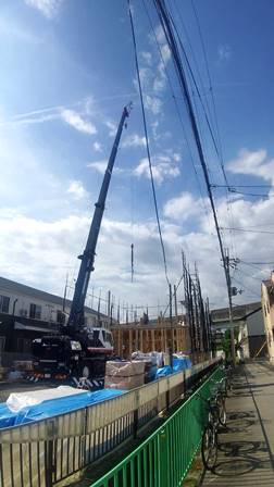 弟は16R 大阪で木造建て方へ 縦長物件で孫出し・・・(;^ω^) 少し残業して2階床まで組んで材料揚げて本日修了