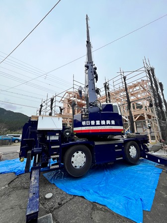16tは昨日残業1時間した現場で木造建て方2日目 本日も17時過ぎてから作業終了